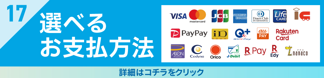お支払い方法もお客様に合わせて選べるよう豊富にご用意しております。クレジットカード、電子マネーなどお好きな方法でご購入いただけます。
