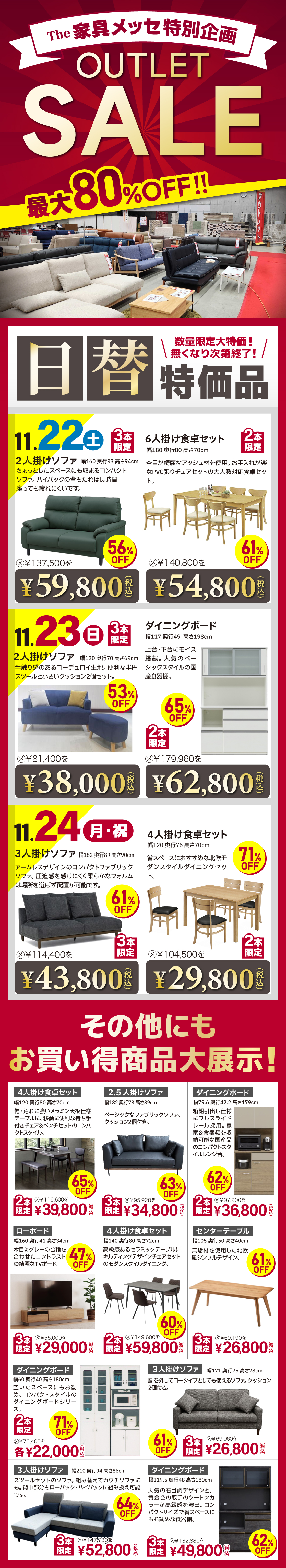 アウトレットコーナーでは最大80%OFFのお得な商品が勢ぞろい!一部商品は数に限りがございますので、お早めのご来場をおすすめいたします。