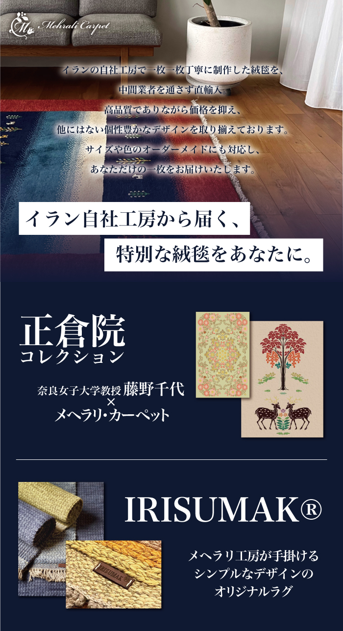 メヘラリ・カーペットはイランの自社工房で一枚一枚制作した絨毯を、中間業者を通さず日本へ直輸入。