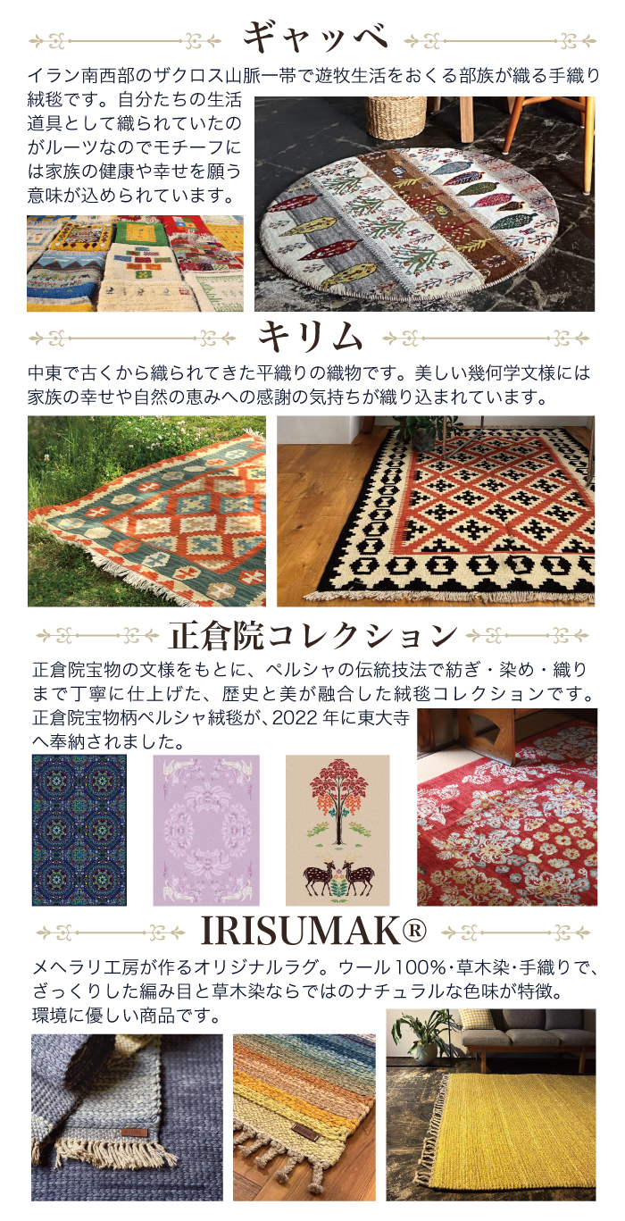 個性豊かなギャッベをはじめ、ウール100%・草木染の「IRISUMAK」、